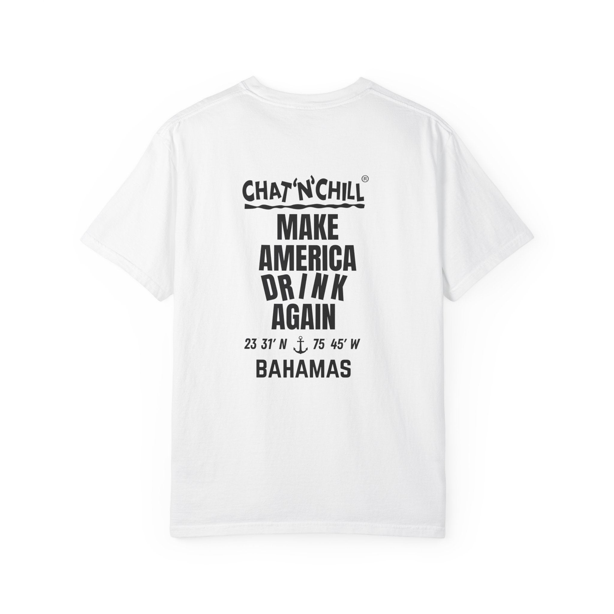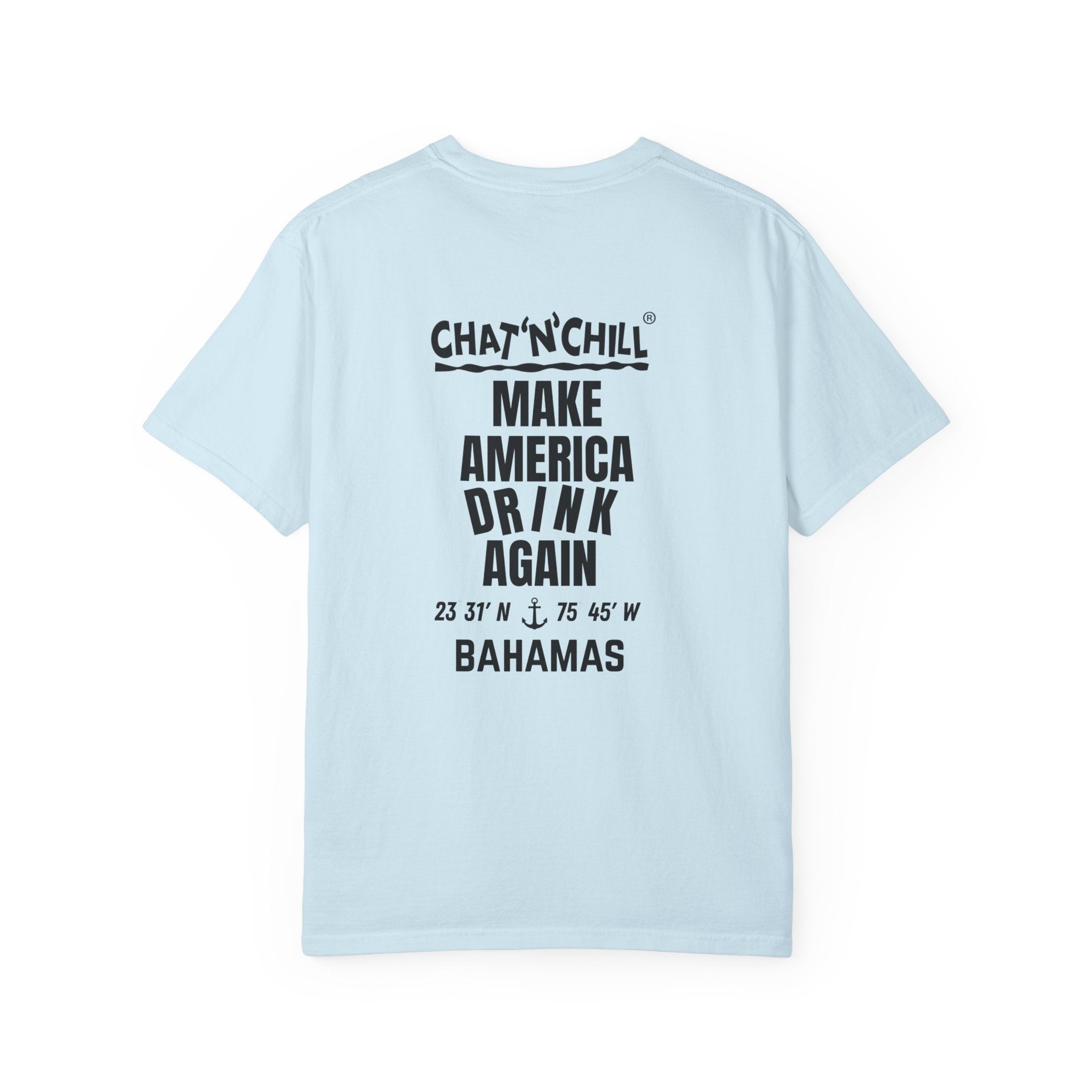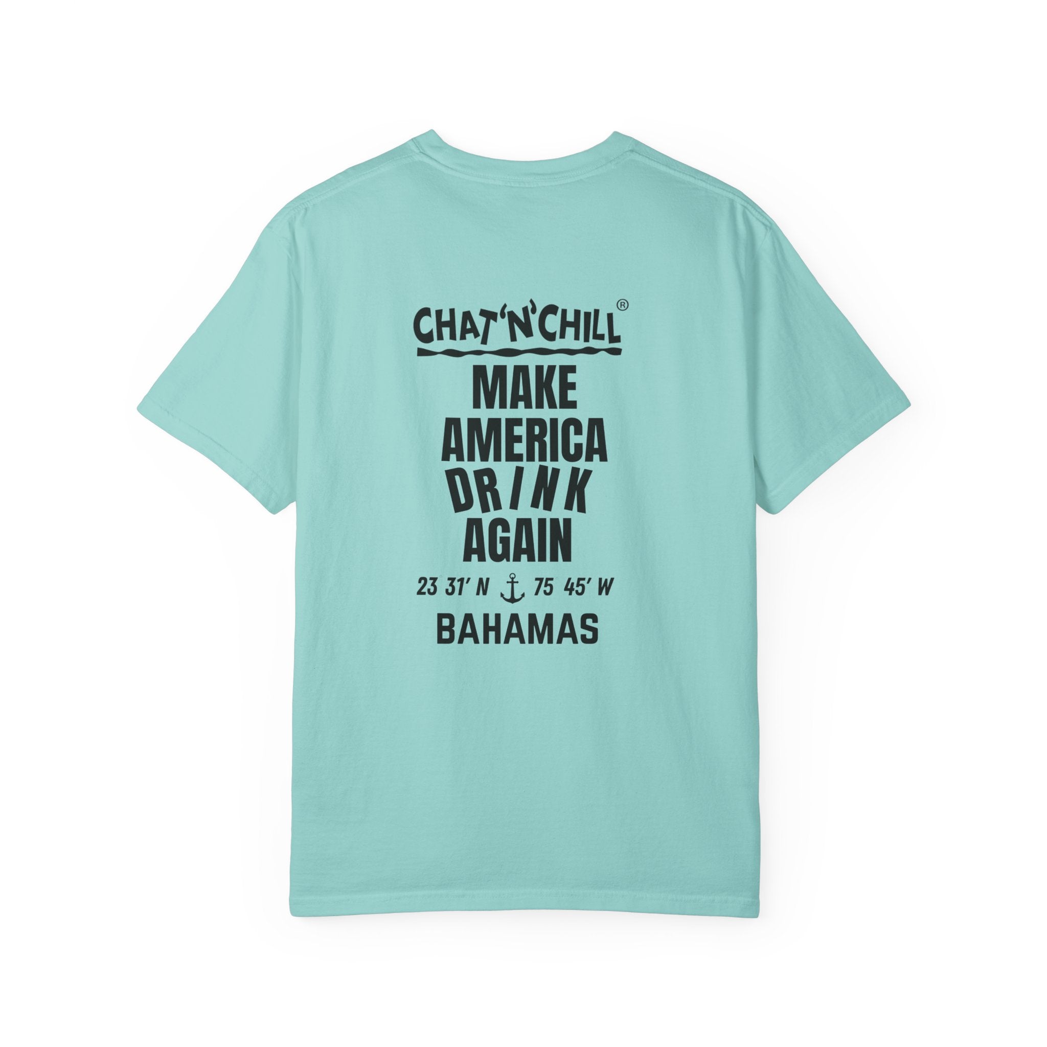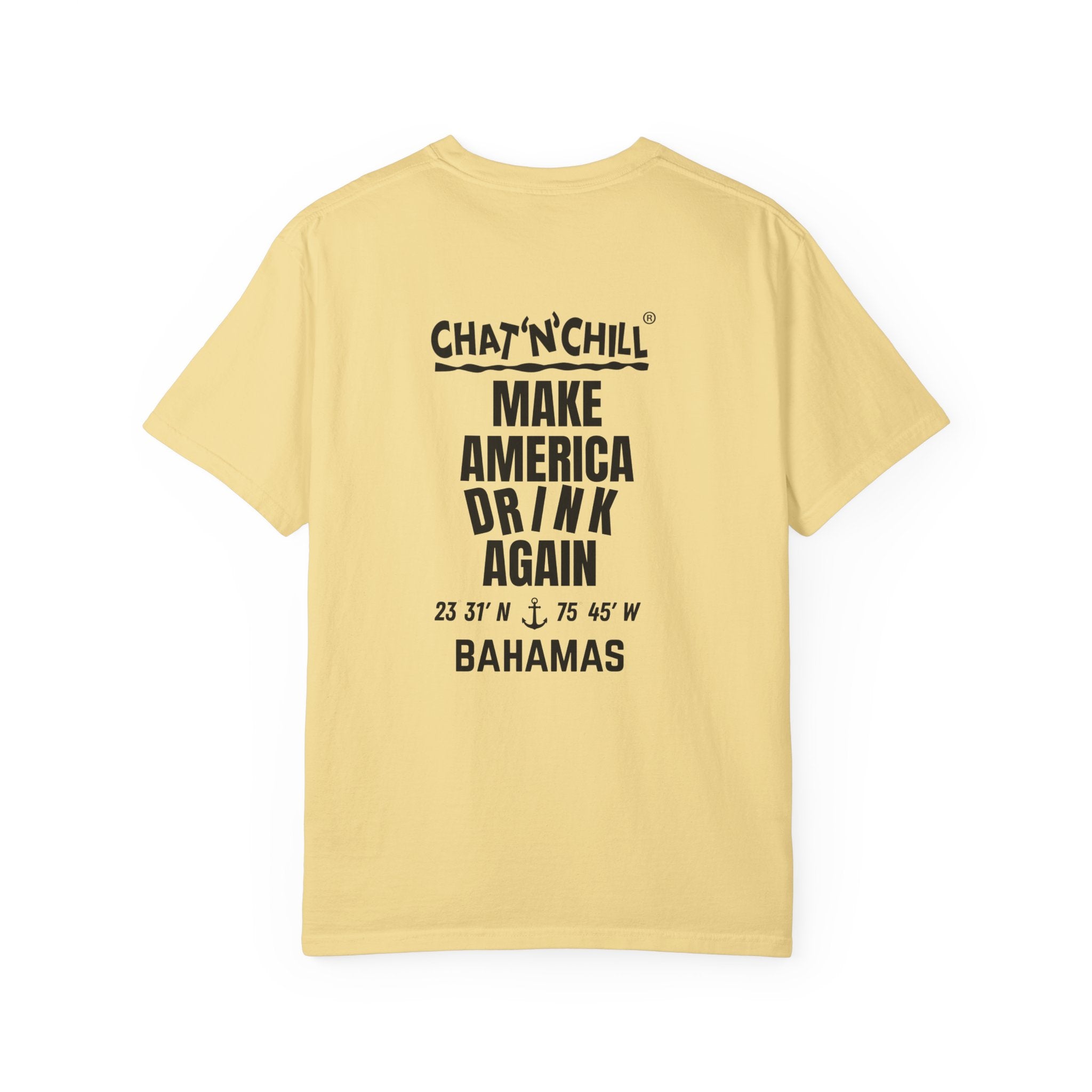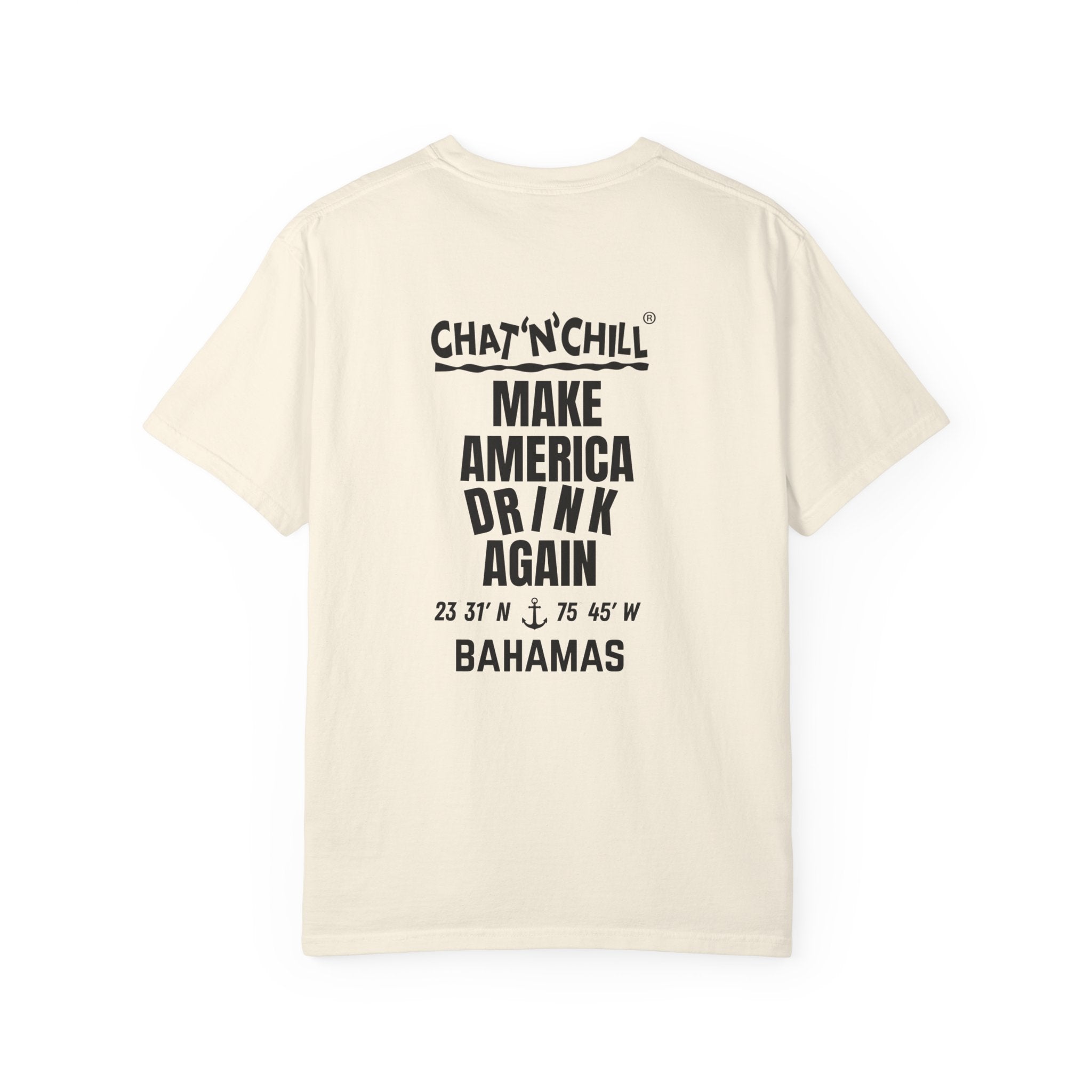 Lightweight, lived-in comfort with a salty, sunlit attitude like Chat 'N' Chill®. This garment-dyed tee feels broken-in from the first wear — soft, substantial 100% ring-spun cotton with a relaxed fit that drapes easily over boardshorts or jeans. A small chest print keeps the look understated up front, while the bold back graphic — “Make America Drink Again” with nautical coordinates and the Bahamas callout — reads like a postcard from a weekend that never ended. It’s for slow afternoons on the dock, late-night bonfires, and travelers who collect places more than plans