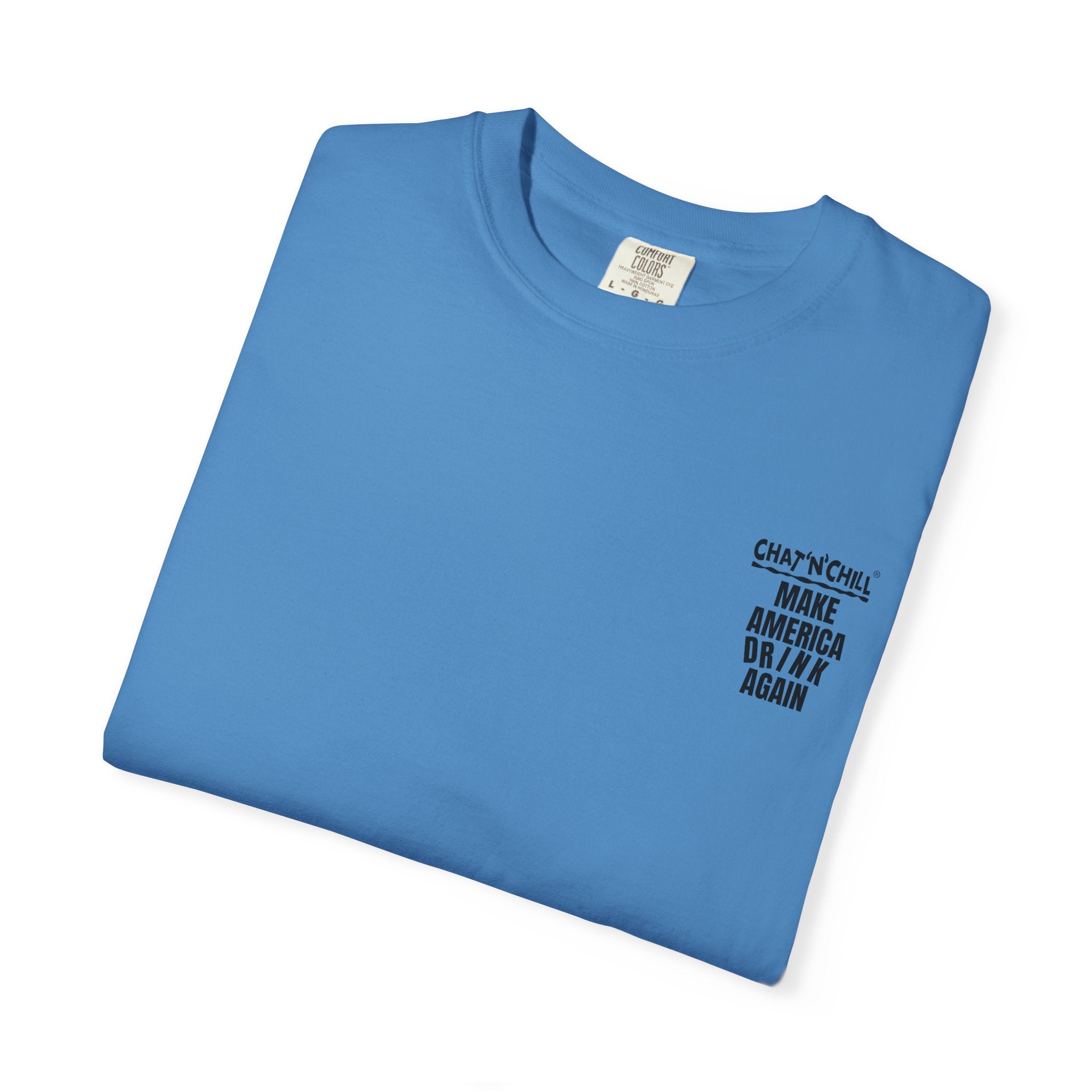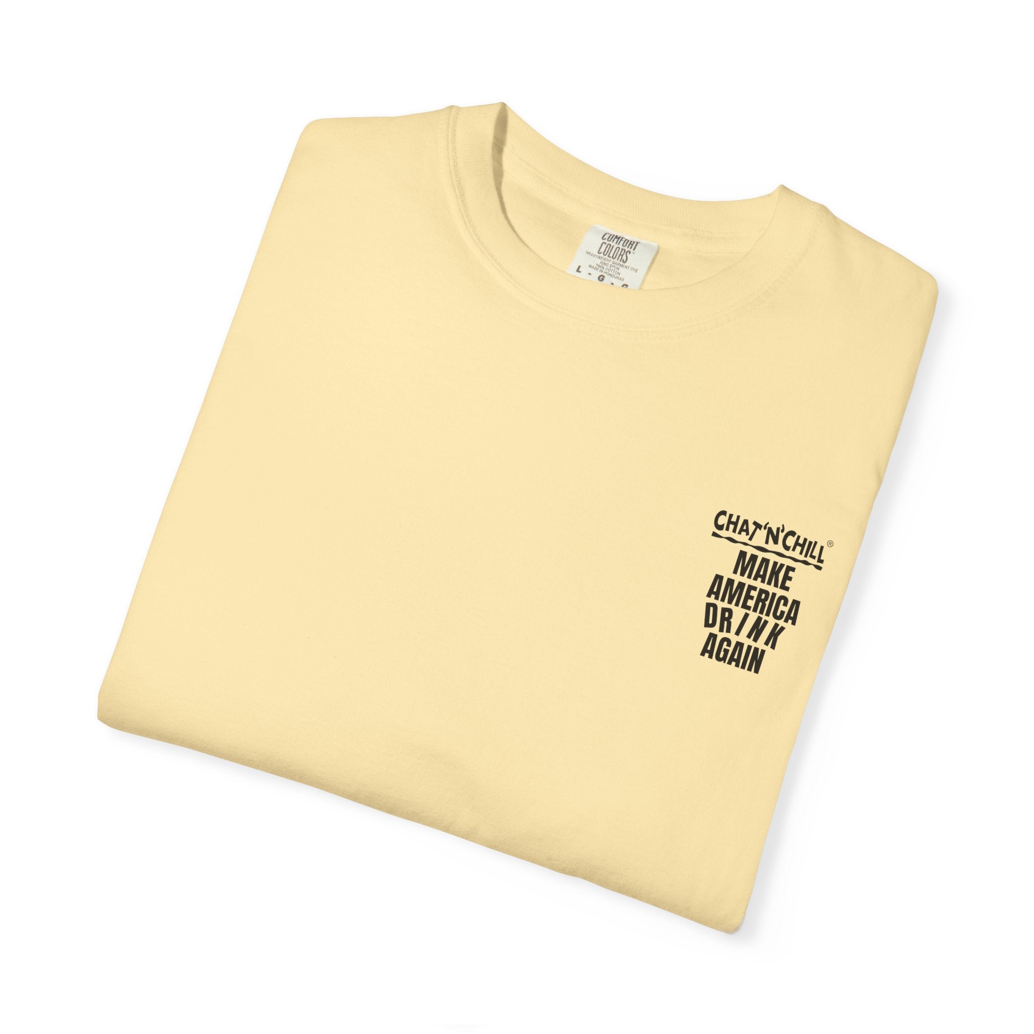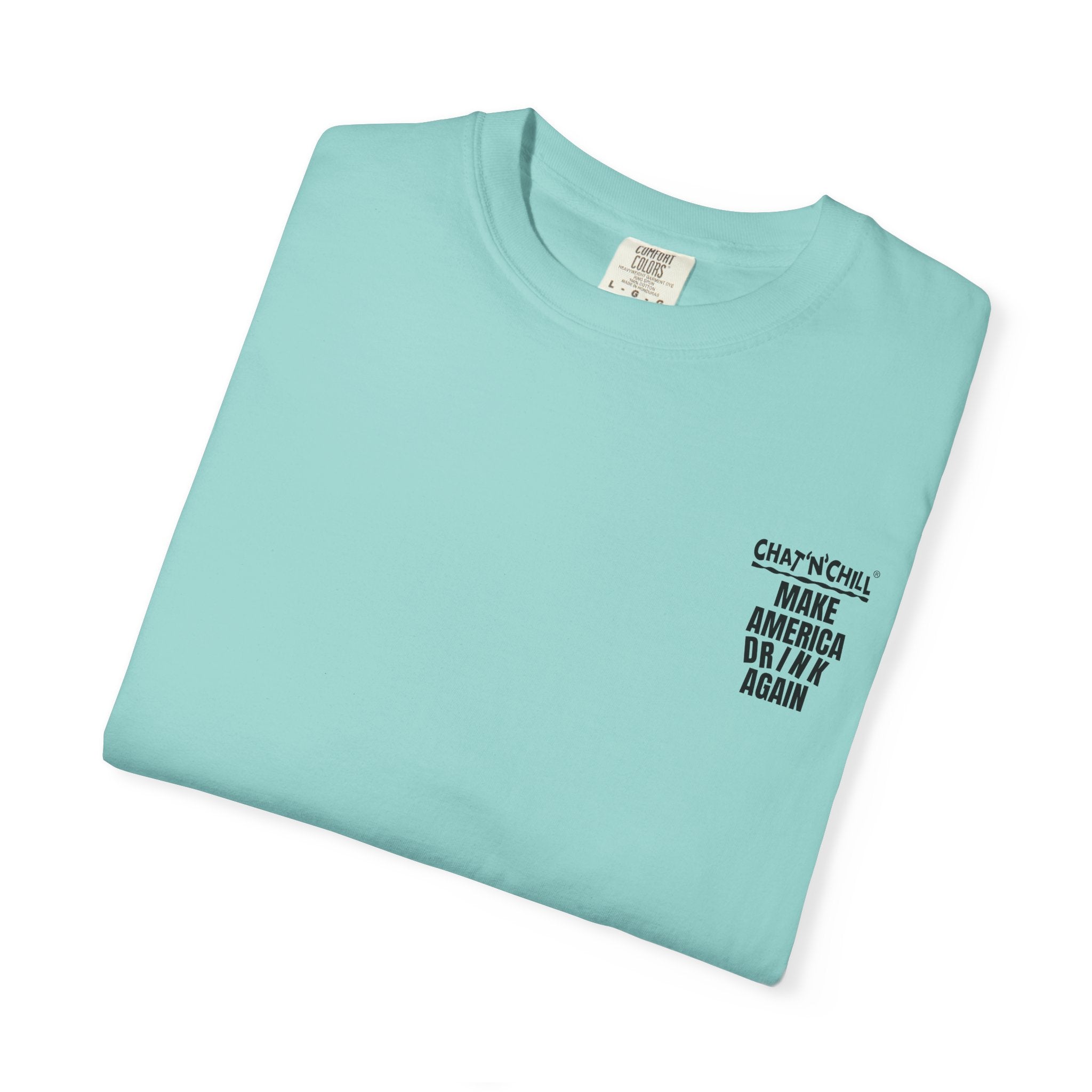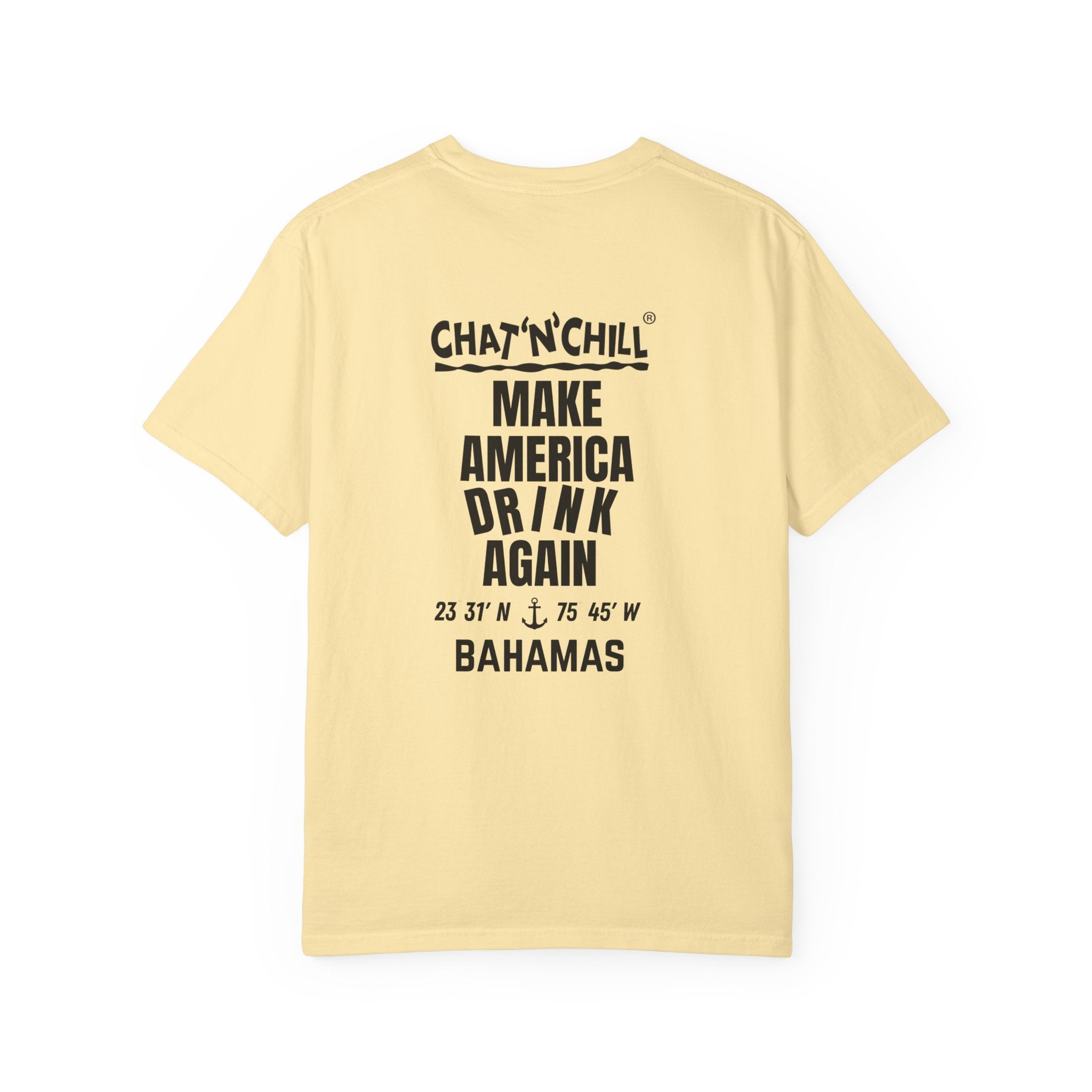 Lightweight, lived-in comfort with a salty, sunlit attitude like Chat 'N' Chill®. This garment-dyed tee feels broken-in from the first wear — soft, substantial 100% ring-spun cotton with a relaxed fit that drapes easily over boardshorts or jeans. A small chest print keeps the look understated up front, while the bold back graphic — “Make America Drink Again” with nautical coordinates and the Bahamas callout — reads like a postcard from a weekend that never ended. It’s for slow afternoons on the dock, late-night bonfires, and travelers who collect places more than plans