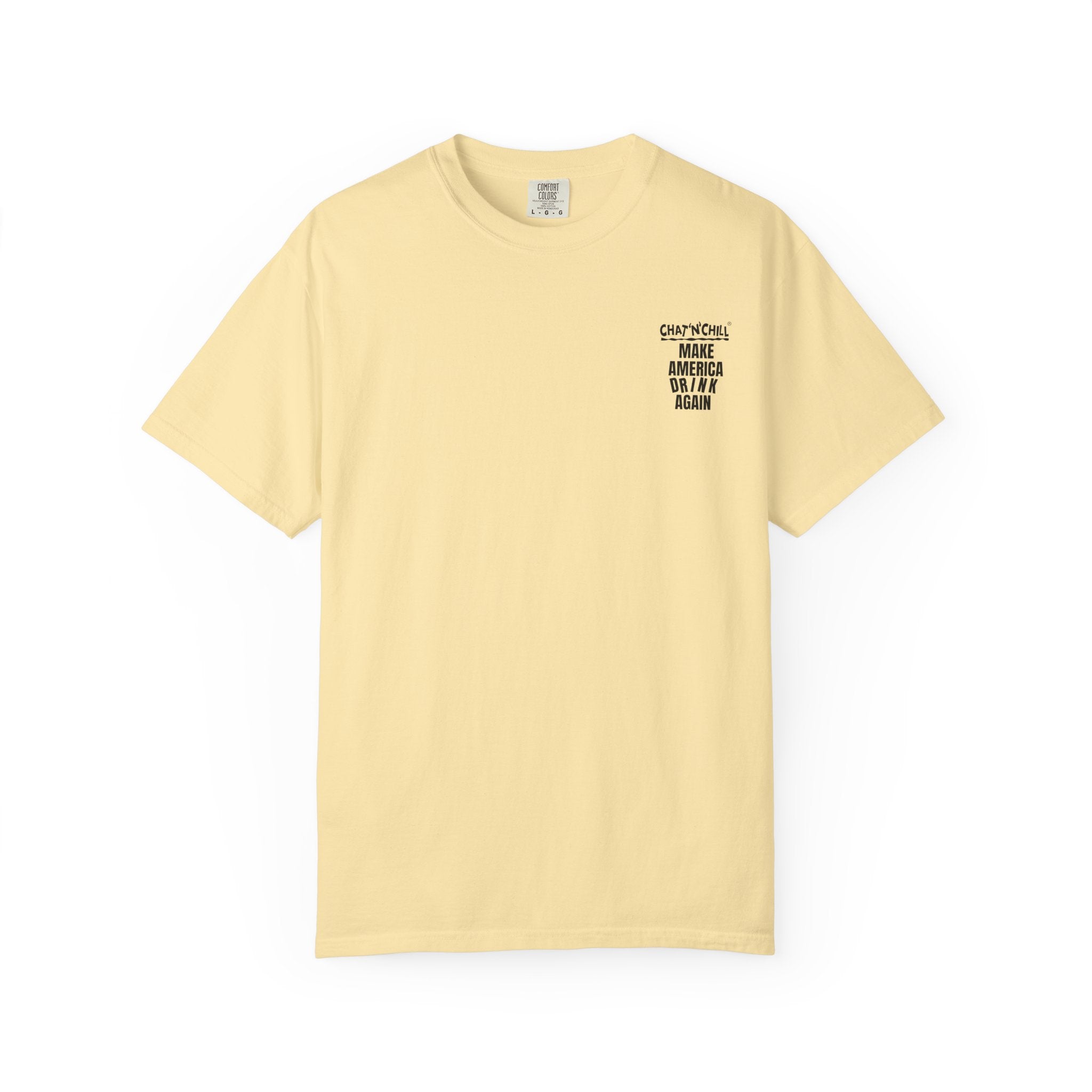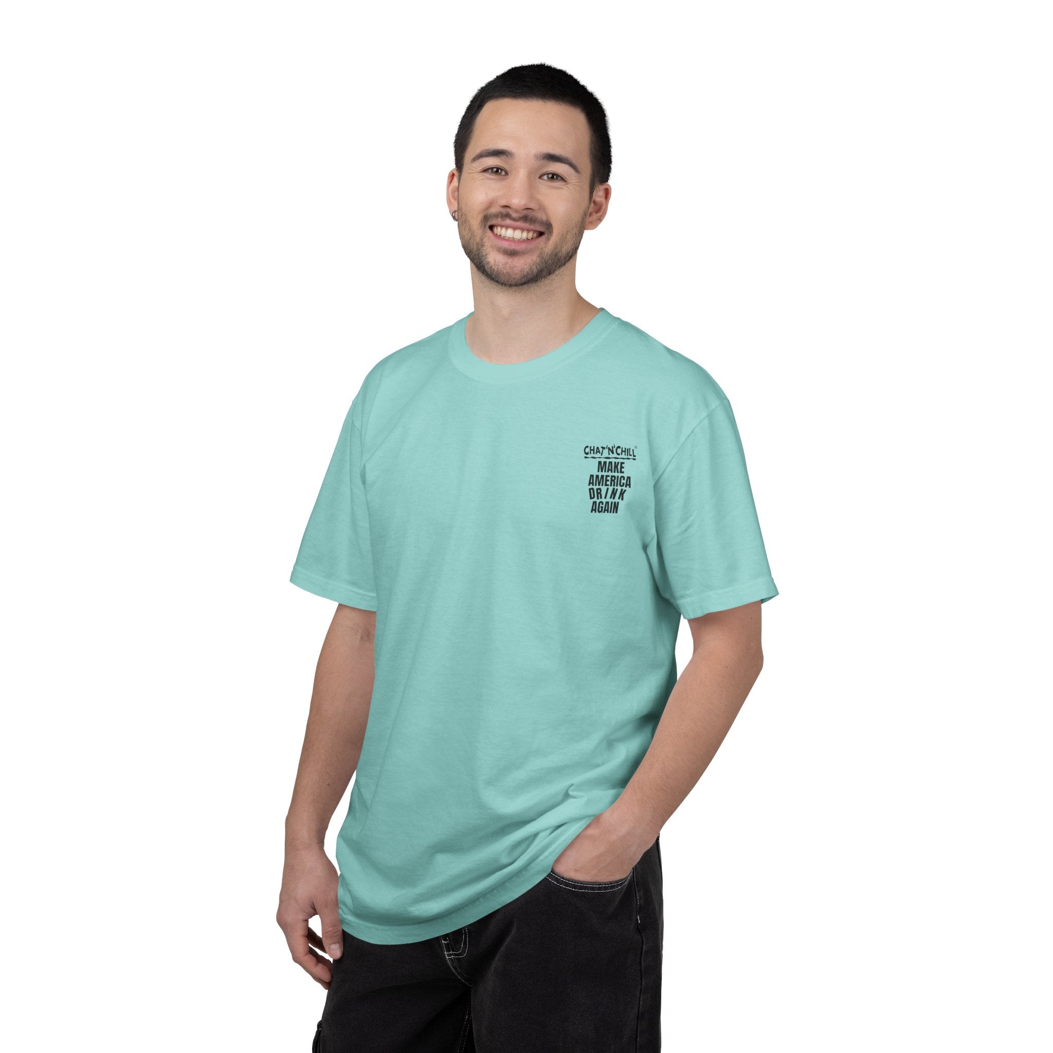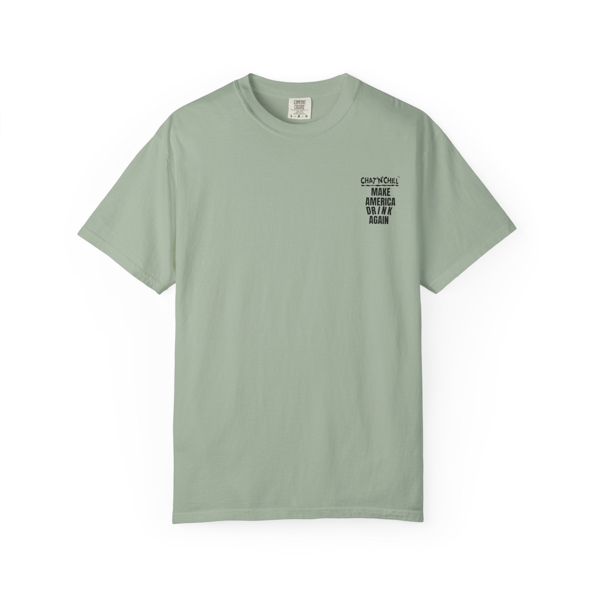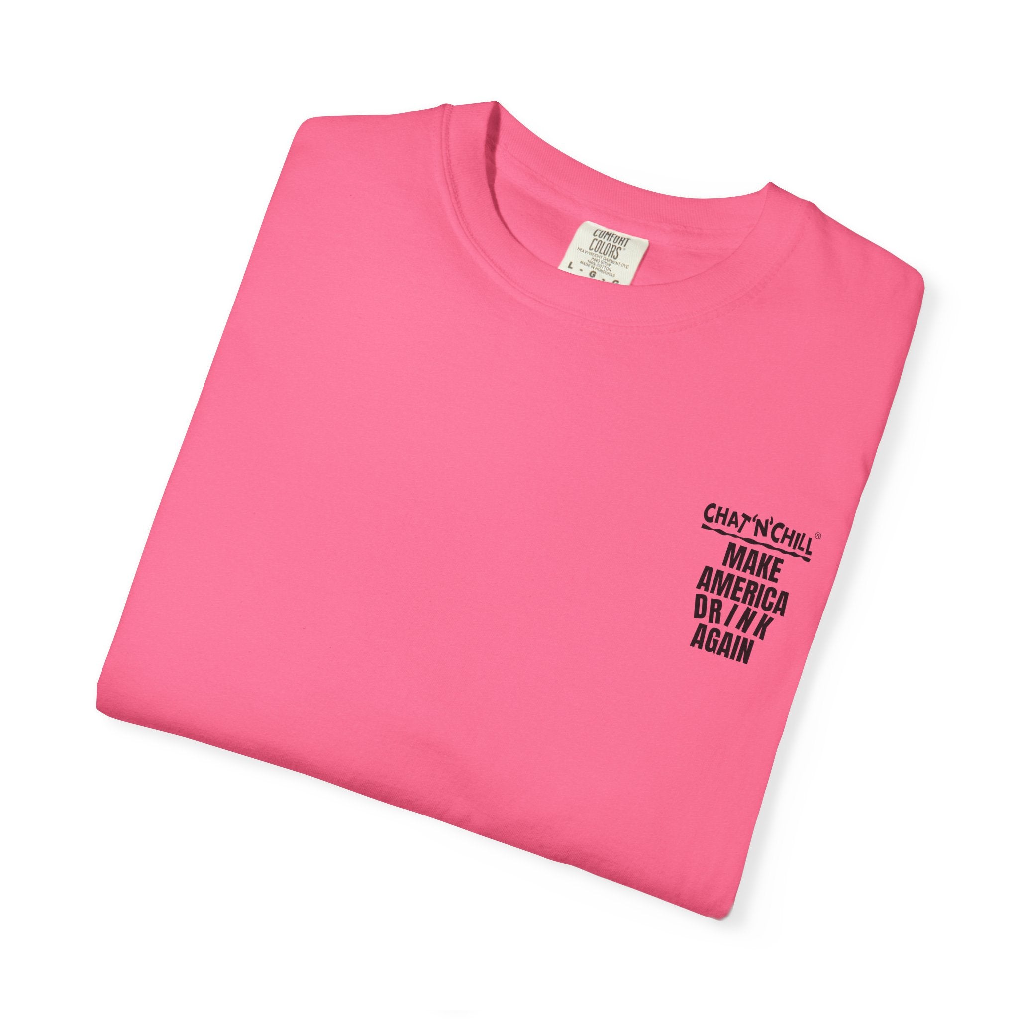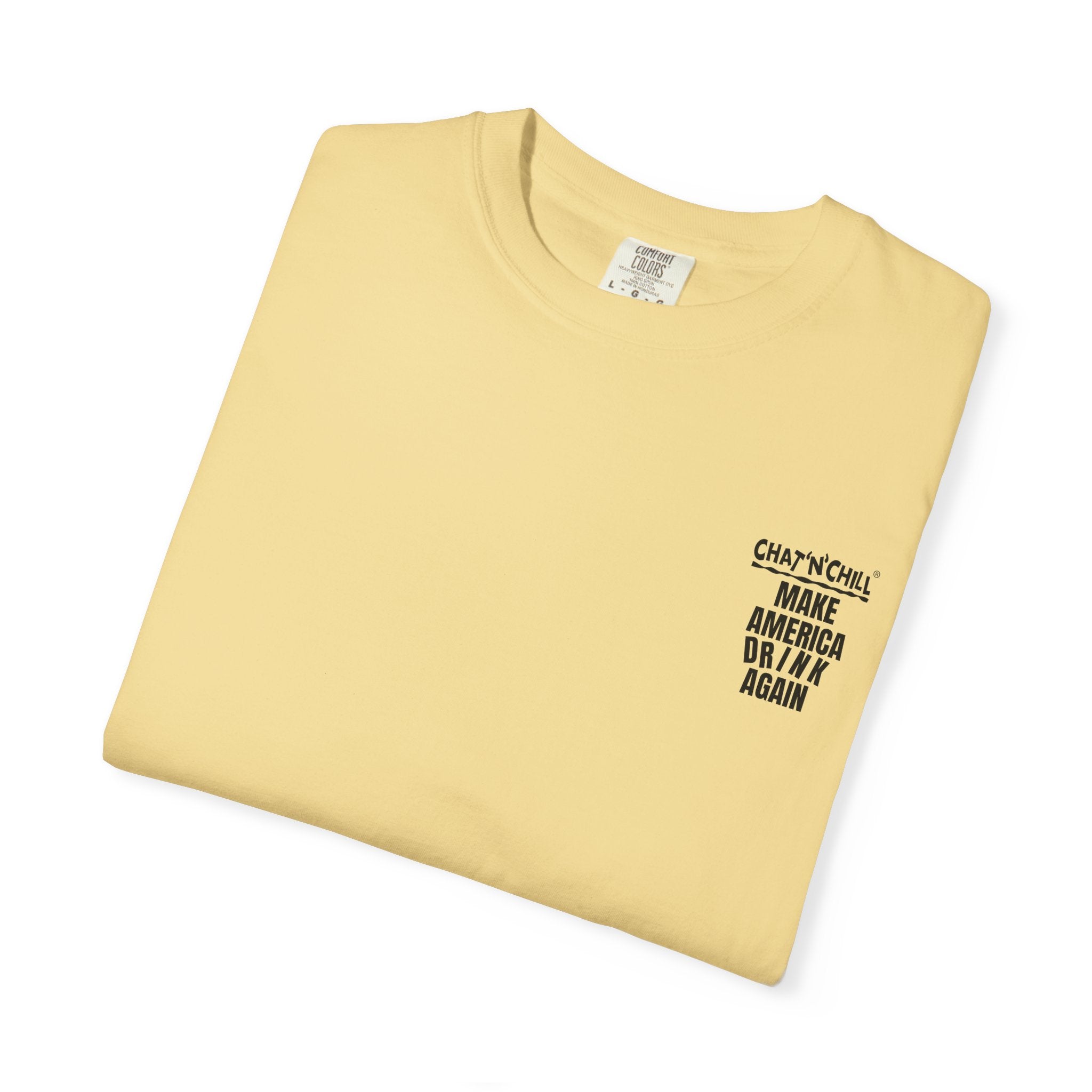Lightweight, lived-in comfort with a salty, sunlit attitude like Chat 'N' Chill®. This garment-dyed tee feels broken-in from the first wear — soft, substantial 100% ring-spun cotton with a relaxed fit that drapes easily over boardshorts or jeans. A small chest print keeps the look understated up front, while the bold back graphic — “Make America Drink Again” with nautical coordinates and the Bahamas callout — reads like a postcard from a weekend that never ended. It’s for slow afternoons on the dock, late-night bonfires, and travelers who collect places more than plans