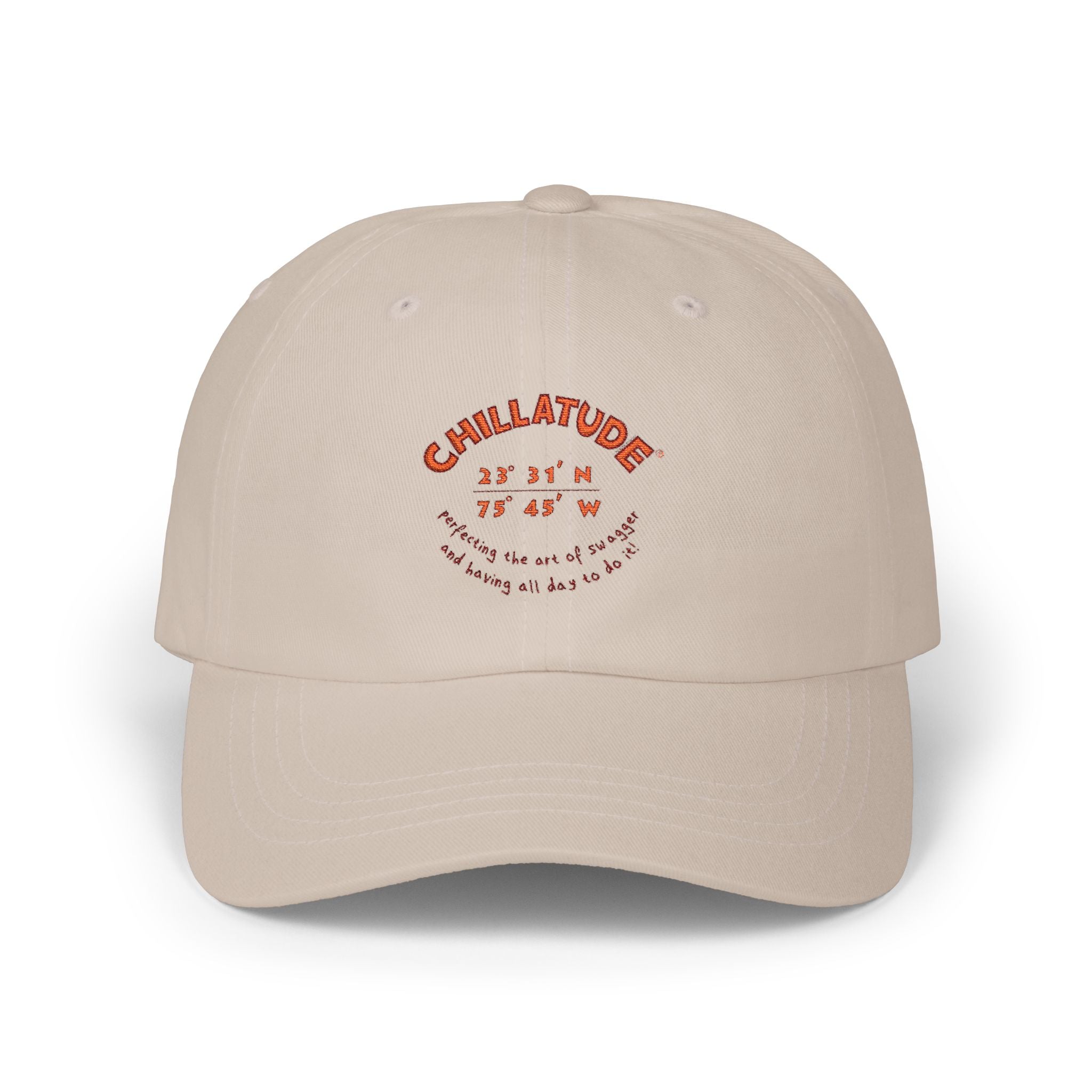 The low-profile, unstructured crown and pre-curved Permacurv® visor soften a relaxed silhouette while the embroidered “CHILLATUDE” with latitude-style coordinates of Chat 'N' Chill® in Exuma, Bahamas. Wear it on slow mornings with coffee in hand, on long drives with the windows down, or to pull a hoodie together on chilly evenings. The hideaway strap with antique brass buckle lets you dial in the fit without fuss. It’s a hat that fades into the background while quietly shaping how your day feels.