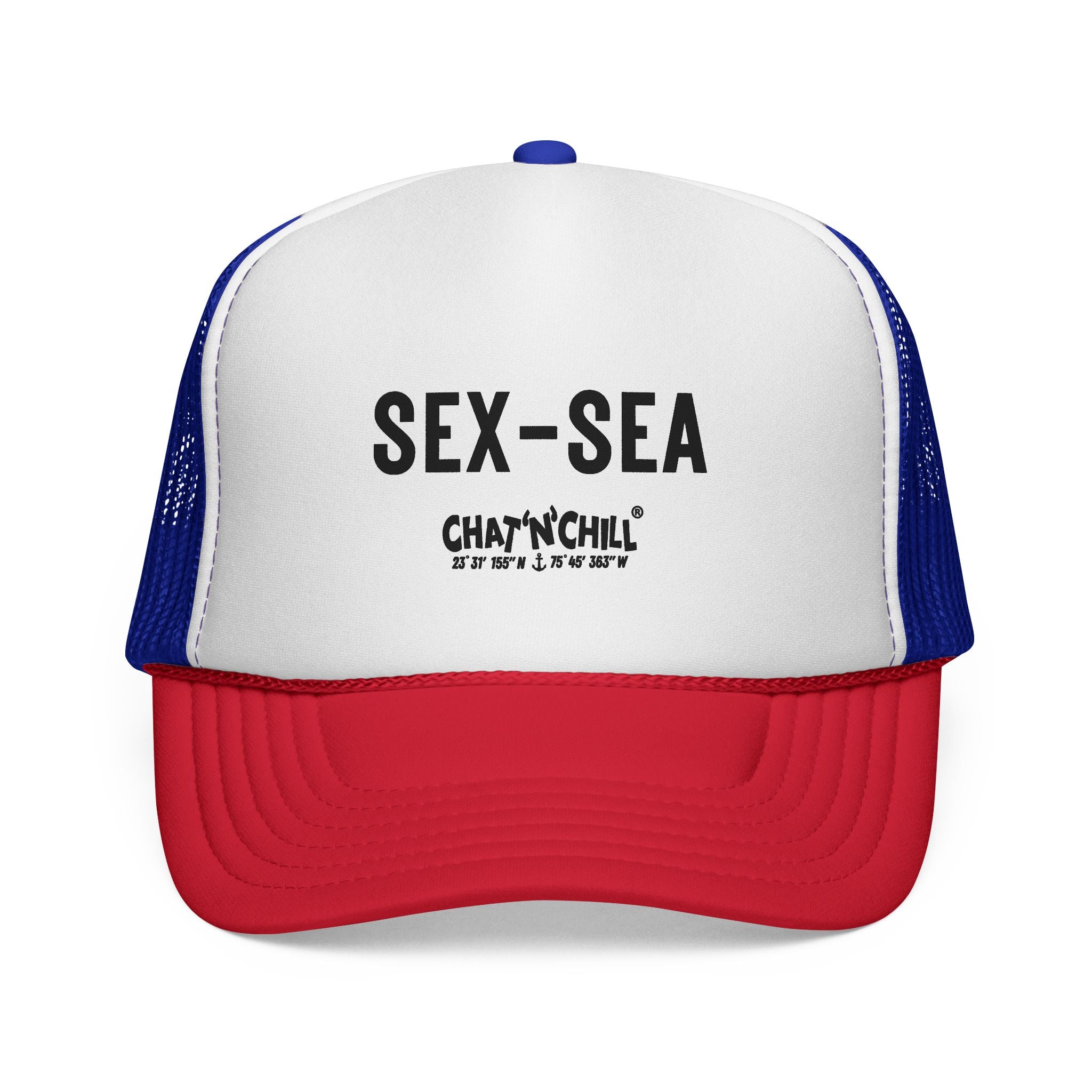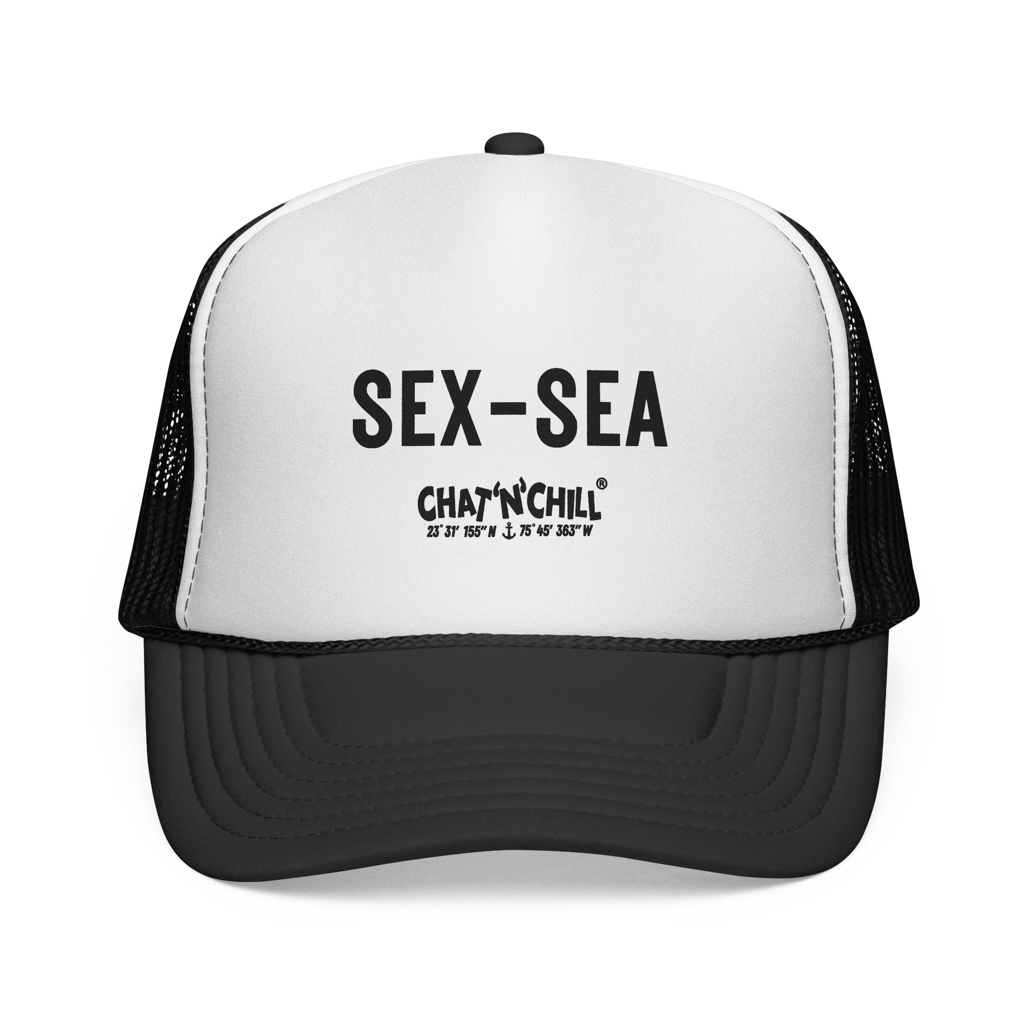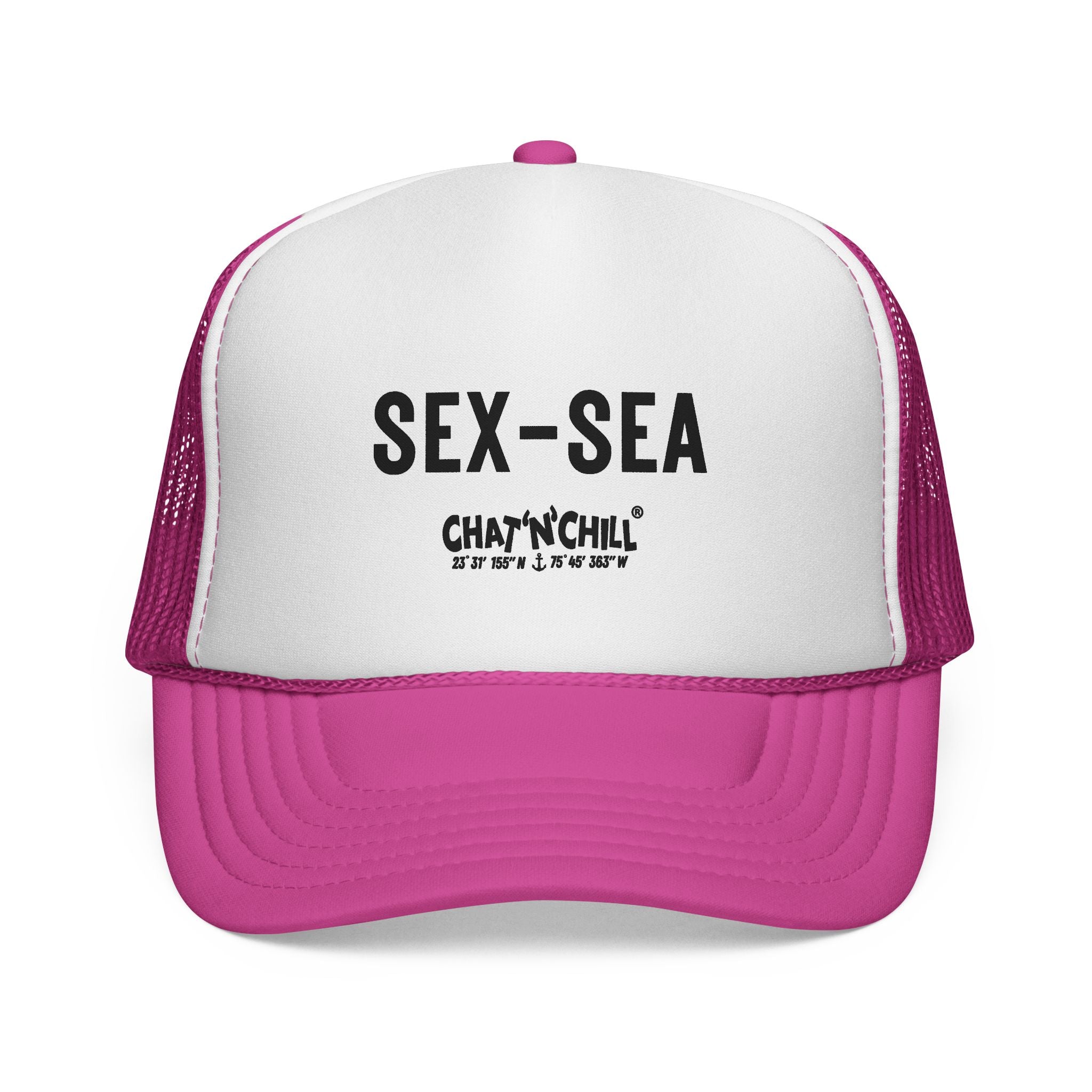 Vintage beach vibes with a bold twist. The Sex-Sea Retro Beach Foam Cap by Chat ’N’ Chill® brings throwback style straight to the shoreline. Inspired by classic surf-shop foam caps, this lightweight essential is all about easy comfort, sun-ready function, and unapologetic attitude. A vintage-style trucker cap with attitude. Lightweight foam front and ventilated mesh back keep you cool on long drives, beach days, and late-night hangs. Bold, distressed lettering sits front and center for an easygoing, rebellious vibe that pairs with worn denim, concert tees, or a sun-faded button-down. The snapback adjusts to your head and the color-matched details — undervisor, sweatband, braid and closure — give the cap a finished, wearable look.